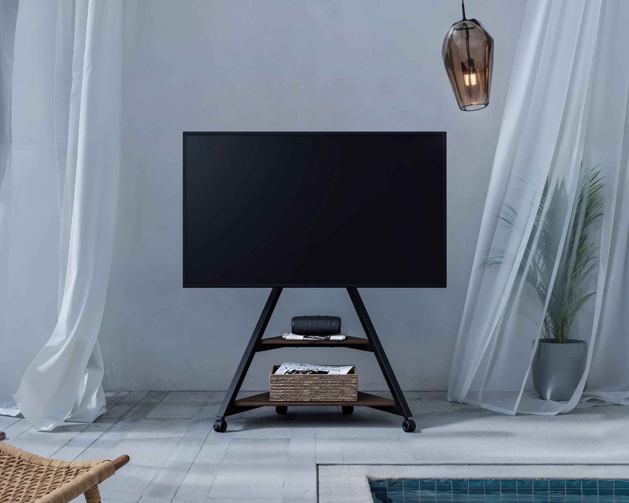 - Movable TV stand with reliable brakes: Glide effortlessly, lock firmly — quick mobility and safe positioning for any outdoor scene.